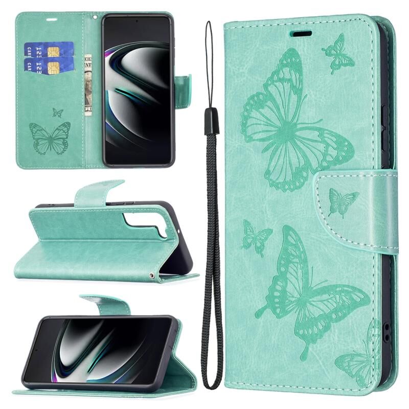 Θήκη τηλεφώνου δερμάτινη με ανάγλυφο σχέδιο δύο πεταλούδων για Samsung Galaxy S22 Ultra 5G, με βάση στήριξης, θήκη για κάρτες, πορτοφόλι και λουρί (Μωβ)