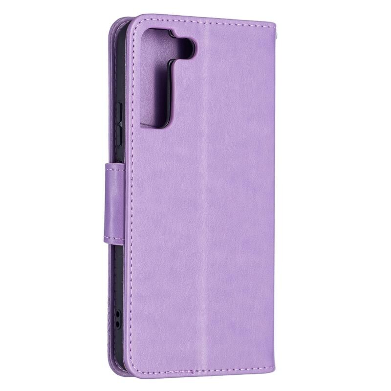 Θήκη τηλεφώνου δερμάτινη με ανάγλυφο σχέδιο δύο πεταλούδων για Samsung Galaxy S22 Ultra 5G, με βάση στήριξης, θήκη για κάρτες, πορτοφόλι και λουρί (Μωβ)