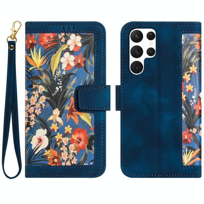 Θήκη τηλεφώνου Samsung Galaxy S22 Ultra 5G από δέρμα με λουλουδάτο σχέδιο και κορδόνι (Πράσινο)