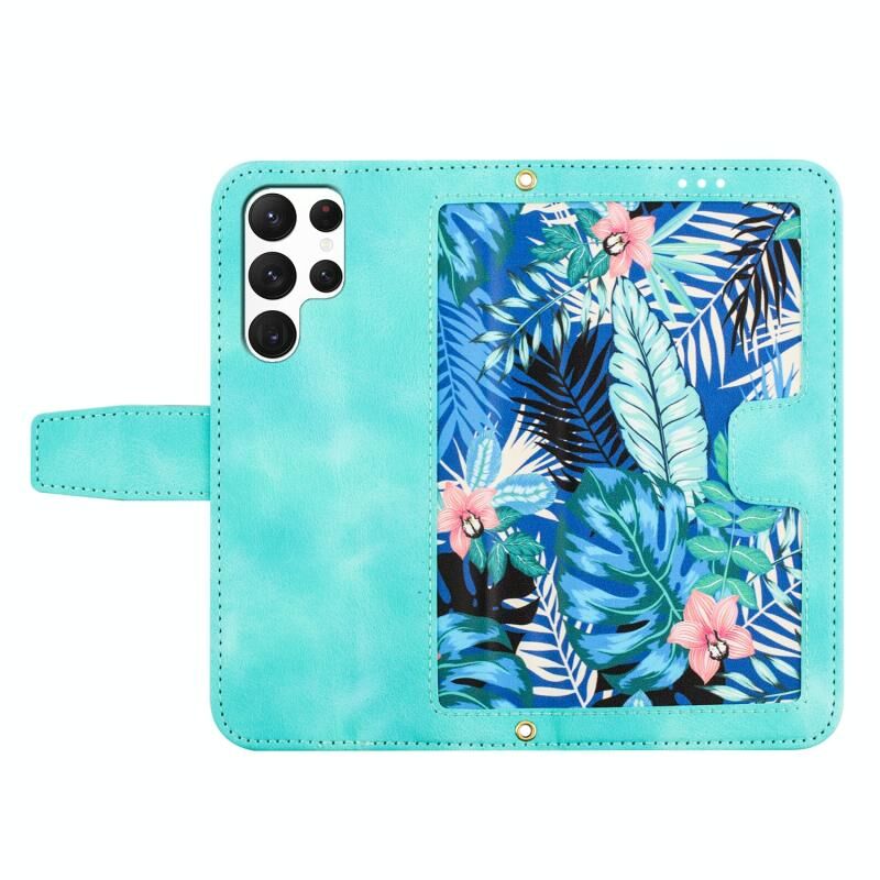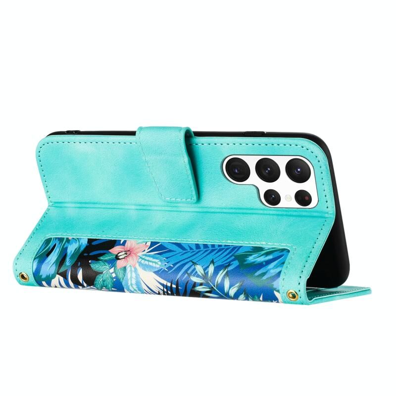 Θήκη τηλεφώνου Samsung Galaxy S22 Ultra 5G από δέρμα με λουλουδάτο σχέδιο και κορδόνι (Πράσινο)