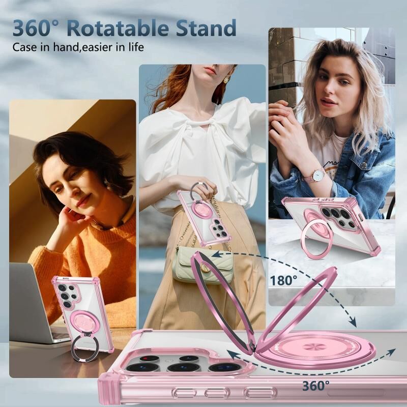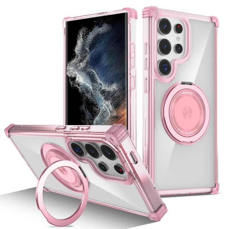 Θήκη κινητού τηλεφώνου Samsung Galaxy S22 Ultra 5G Gold Shield CD Pattern MagSafe Μαγνητική με περιστρεφόμενη βάση (Διαφανές Ροζ)