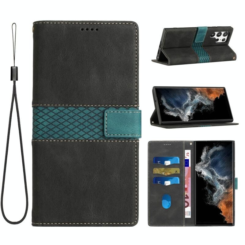 Για Samsung Galaxy S22 Ultra 5G Grid Stitching δερμάτινη θήκη τηλεφώνου με κορδόνι (μαύρο)