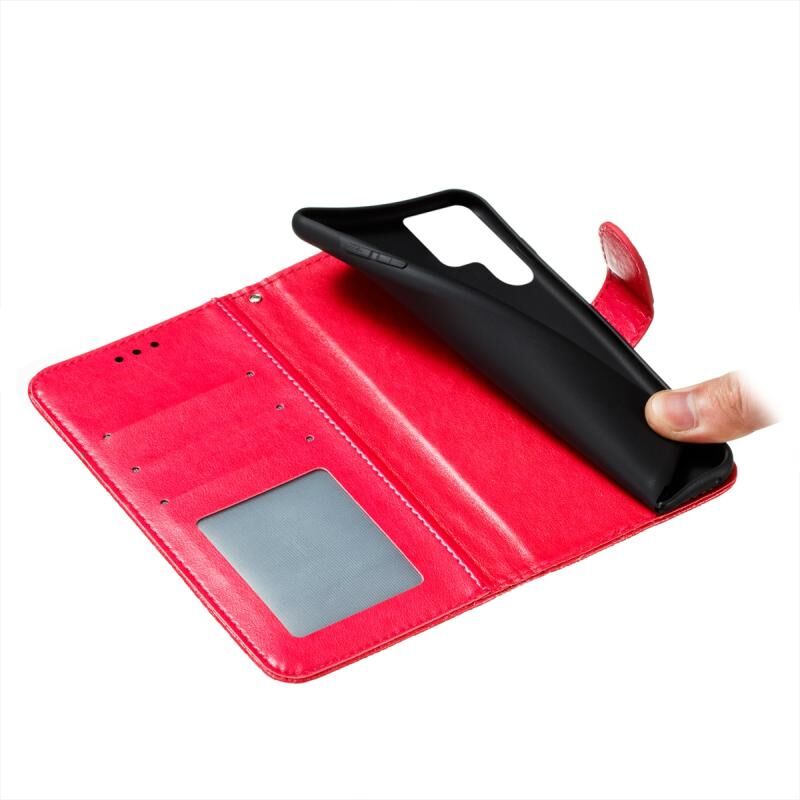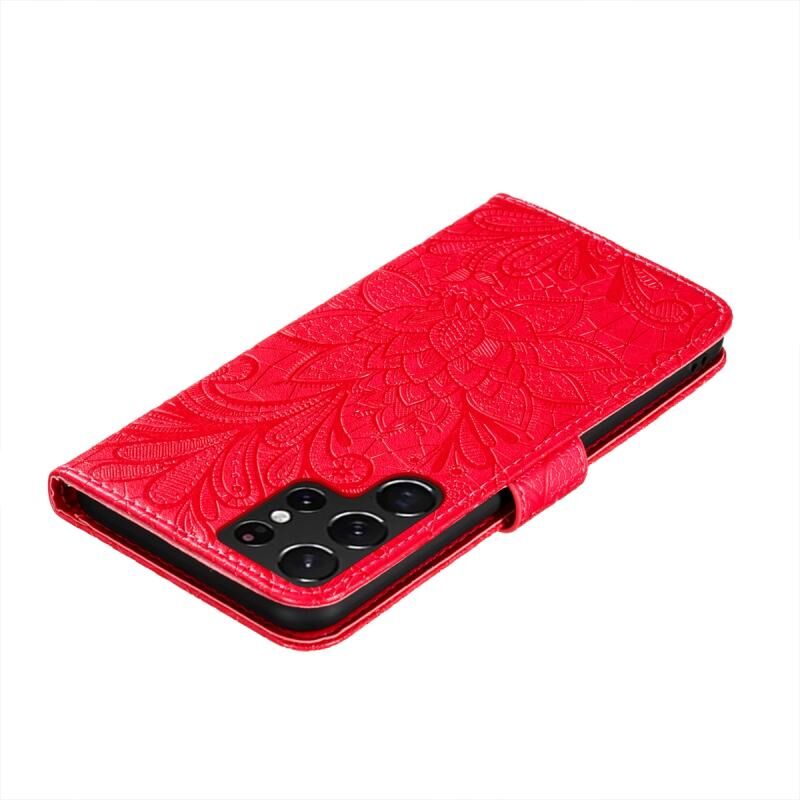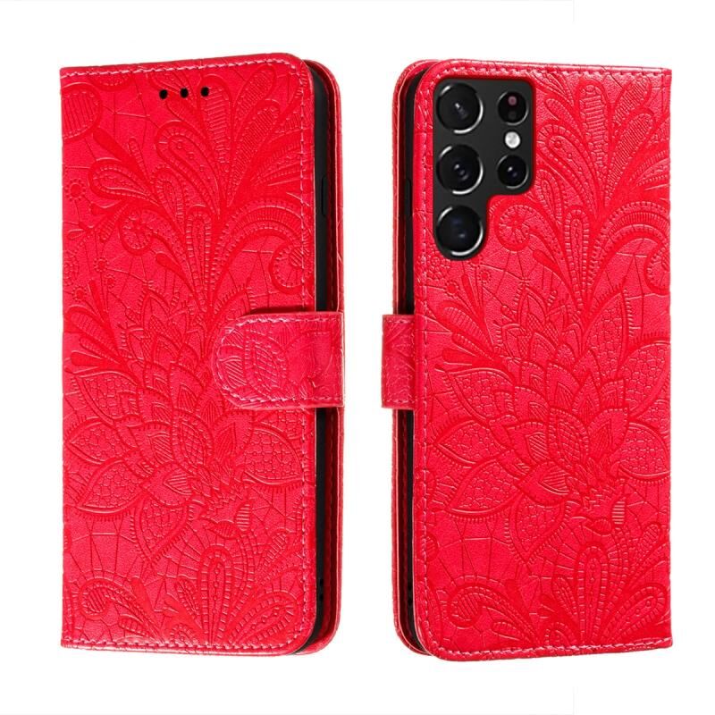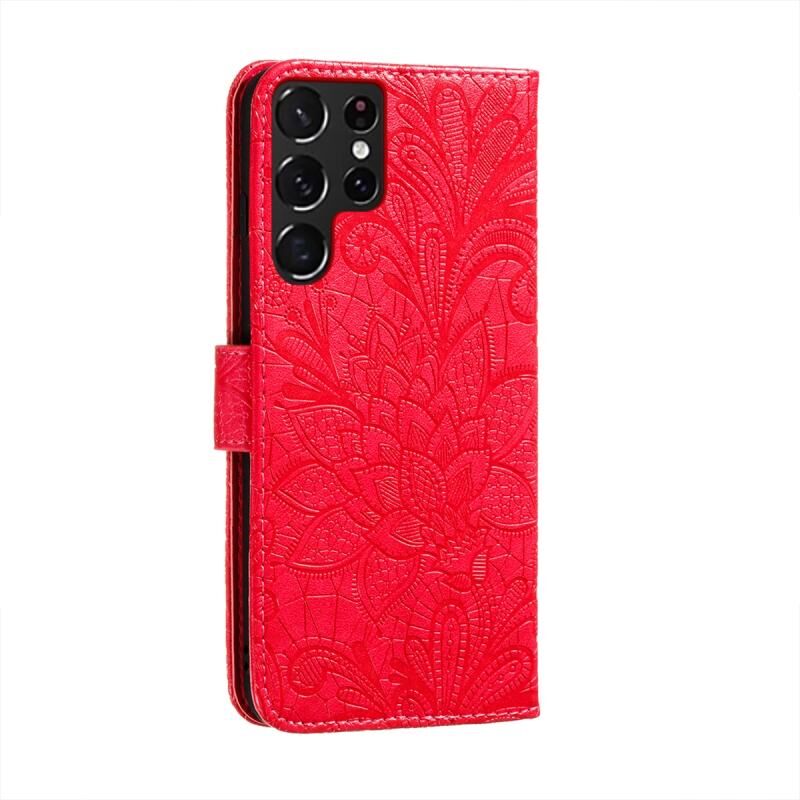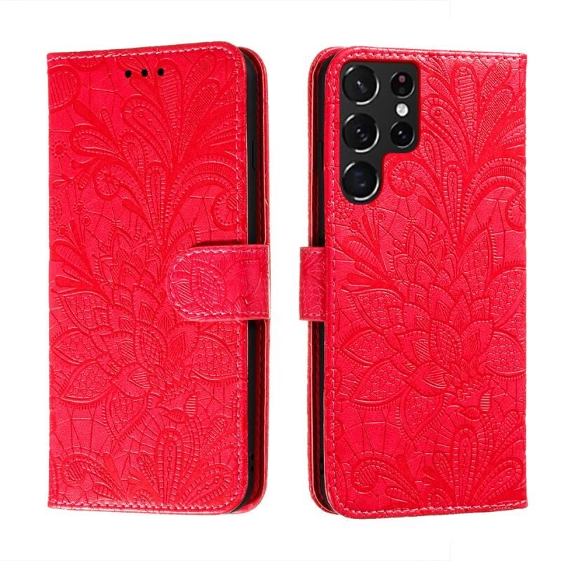 Για Samsung Galaxy S22 Ultra 5G Lace Flower Δερμάτινη θήκη τηλεφώνου με θήκη για κάρτες & υποδοχές & πορτοφόλι & κορνίζα φωτογραφιών (κόκκινο)