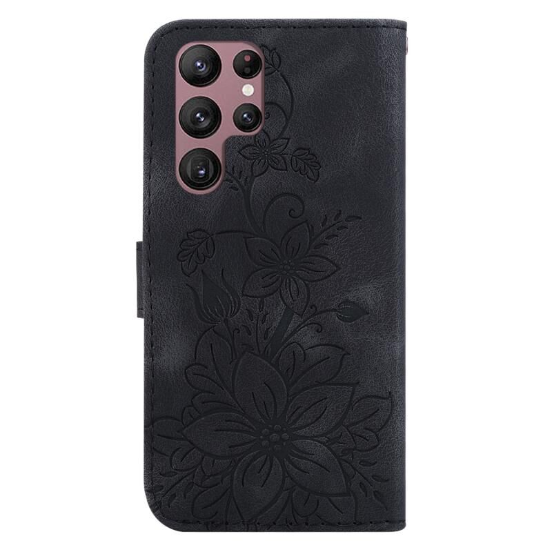 Θήκη τηλεφώνου Samsung Galaxy S22 Ultra 5G από δέρμα με ανάγλυφο σχέδιο Lily (Μωβ)