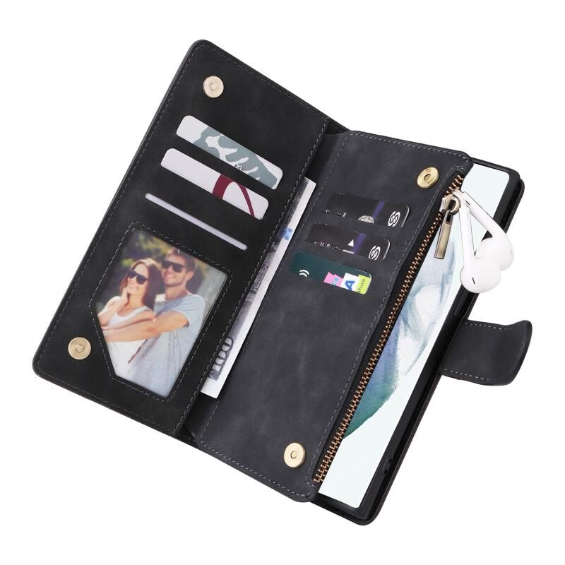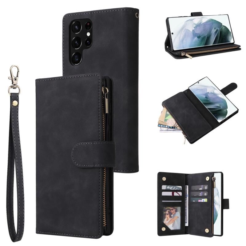 Για Samsung Galaxy S22 Ultra 5G Πολυλειτουργικό παγωμένο φερμουάρ πορτοφόλι δερμάτινη θήκη τηλεφώνου (Μαύρο)