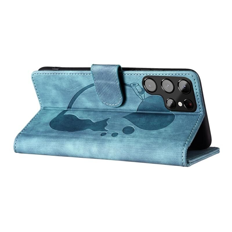 Θήκη τηλεφώνου Samsung Galaxy S22 Ultra 5G με ανάγλυφο σχέδιο καρδιάς και γάτας από δέρμα (Μωβ)