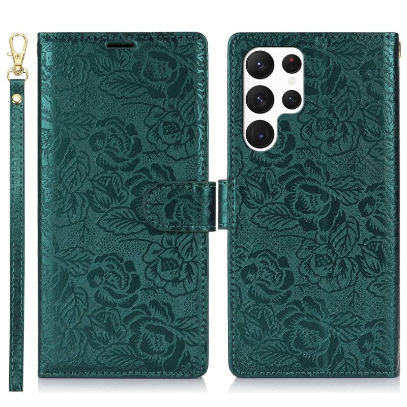 For Samsung Galaxy S22 Ultra 5G Peony Flowers Imprint Leather Phone Case(Green)