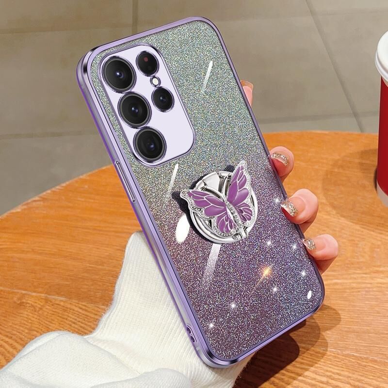 Για Samsung Galaxy S22 Ultra 5G Επιμεταλλωμένο διαβάθμιση Glitter πεταλούδα κάτοχος TPU τηλέφωνο υπόθεση (μωβ)