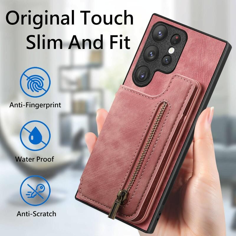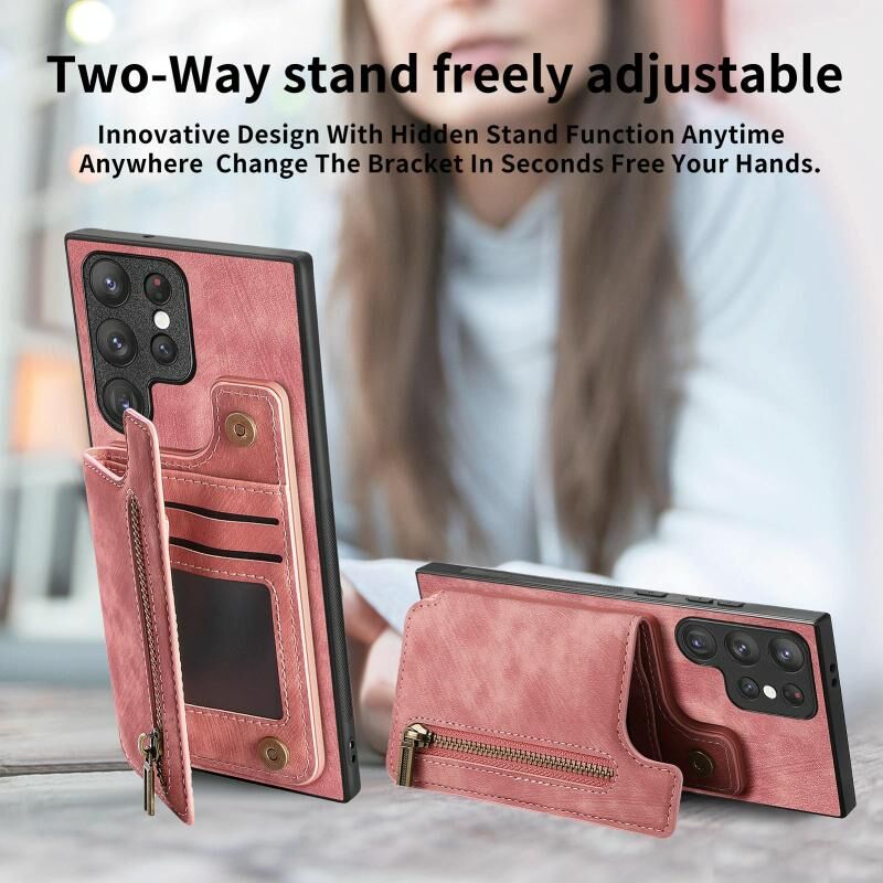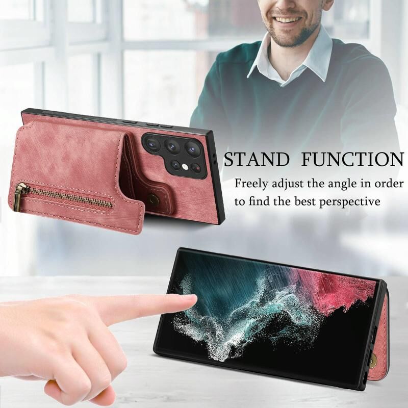 Για Samsung Galaxy S22 Ultra 5G Retro δέρμα φερμουάρ πορτοφόλι πίσω τηλέφωνο υπόθεση (ροζ)