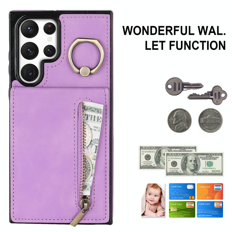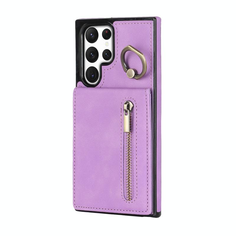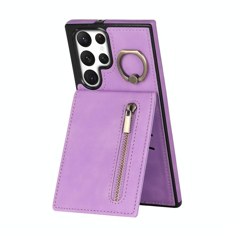 Θήκη κινητού τηλεφώνου Samsung Galaxy S22 Ultra 5G με ρετρό δακτύλιο και φερμουάρ, θήκη καρτών RFID (Καφέ)