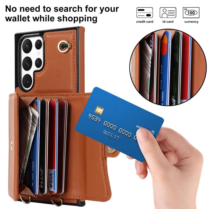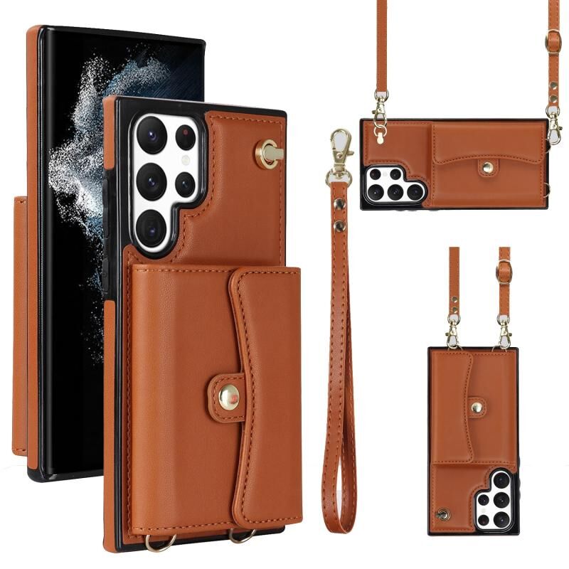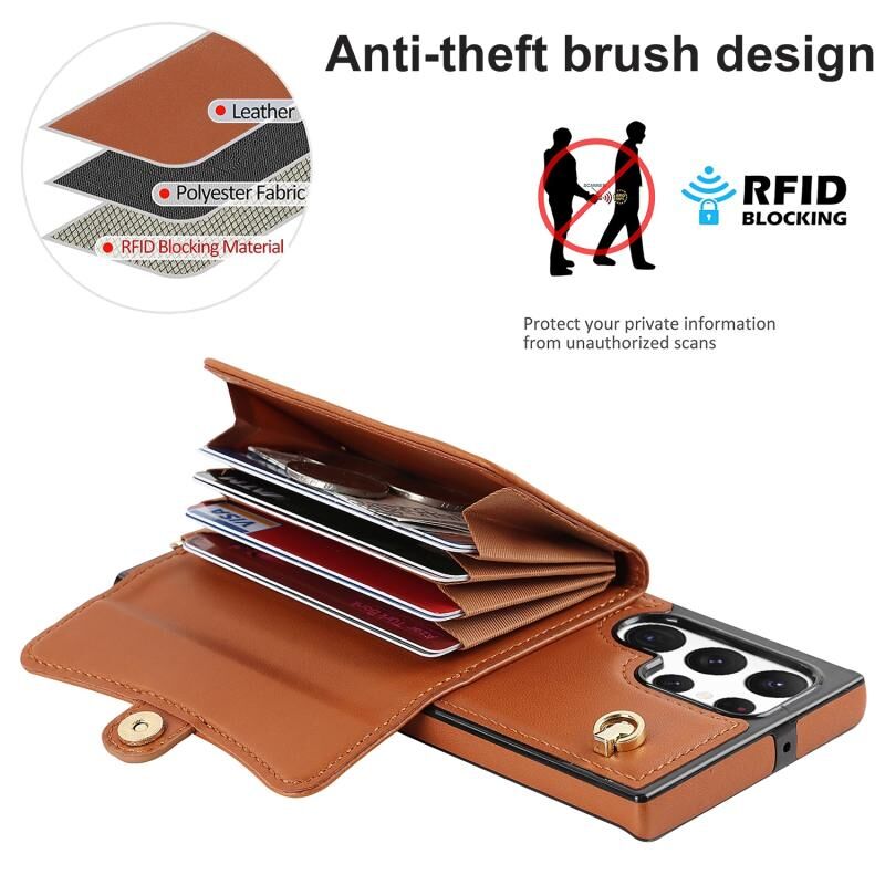 Για Samsung Galaxy S22 Ultra 5G RFID Slot κάρτα δερμάτινη θήκη τηλεφώνου με μακρύ κορδόνι (Καφέ)