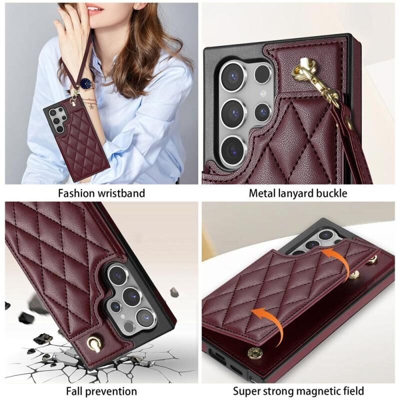 Για Samsung Galaxy S22 Ultra 5G Rhombic Dual Buckle υποδοχές κάρτας υπόθεση τηλεφώνου με κορδόνι (κόκκινο κρασί)