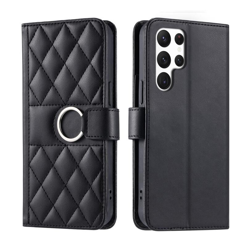 For Samsung Galaxy S22 Ultra 5G Ring Buckle Rhombic Leather Phone Case(Black)