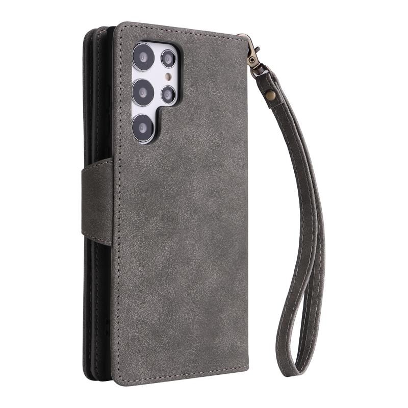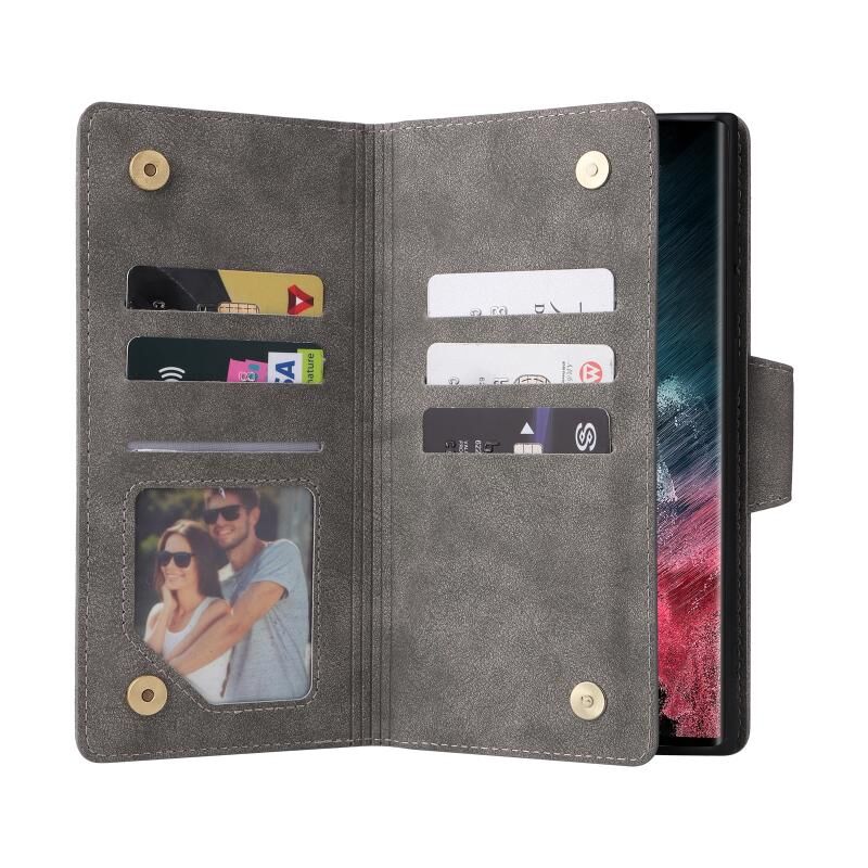 Για Samsung Galaxy S22 Ultra 5G Rivet πόρπη 9 κάρτες τρεις φορές δερμάτινη θήκη τηλεφώνου (γκρι)