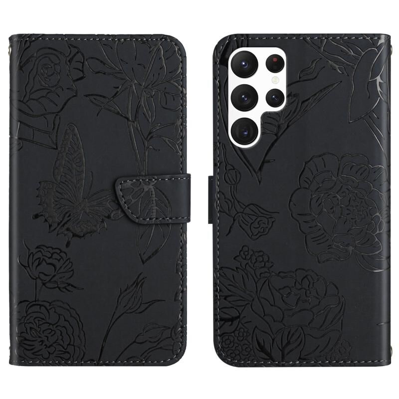 Θήκη τηλεφώνου Samsung Galaxy S22 Ultra 5G από δέρμα με ανάγλυφο σχέδιο πεταλούδας και παιώνιας, με αίσθηση δέρματος (Μαύρο)