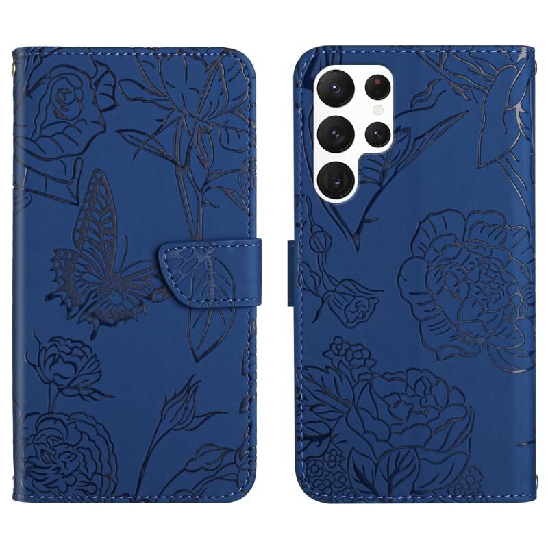 Θήκη τηλεφώνου Samsung Galaxy S22 Ultra 5G από δέρμα με ανάγλυφο σχέδιο πεταλούδας και παιώνιας, με αίσθηση δέρματος (Κόκκινο)