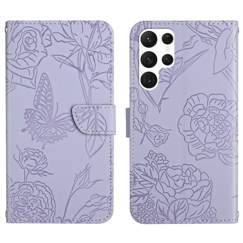 Θήκη τηλεφώνου Samsung Galaxy S22 Ultra 5G από δέρμα με ανάγλυφο σχέδιο πεταλούδας και παιώνιας, με αίσθηση δέρματος (Κόκκινο)