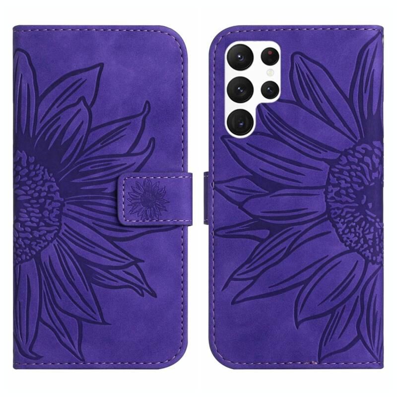 Για το Samsung Galaxy S22 Ultra 5G δέρμα αίσθηση Sun Flower μοτίβο Flip δέρμα τηλέφωνο υπόθεση με κορδόνι (σκούρο μωβ)