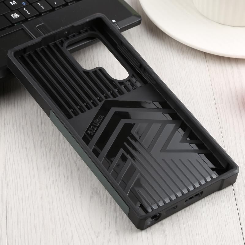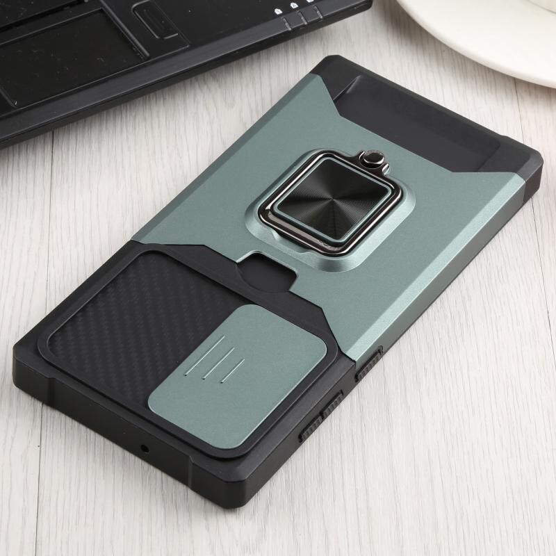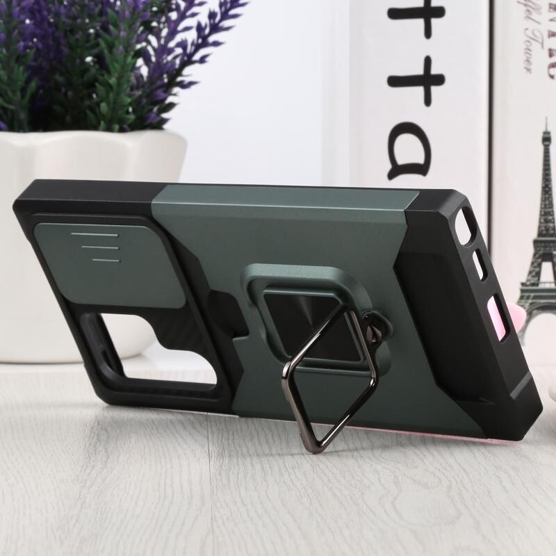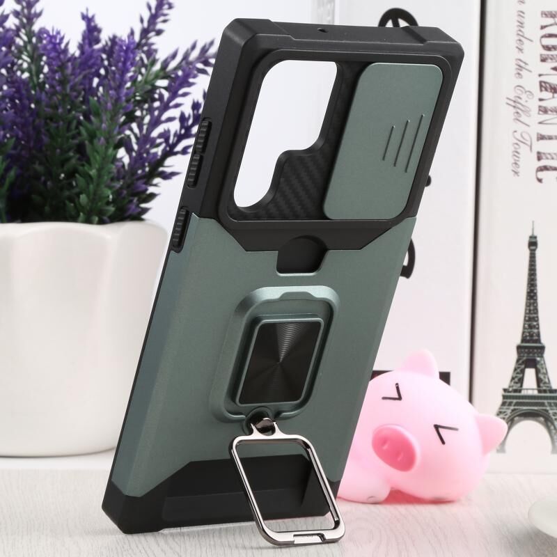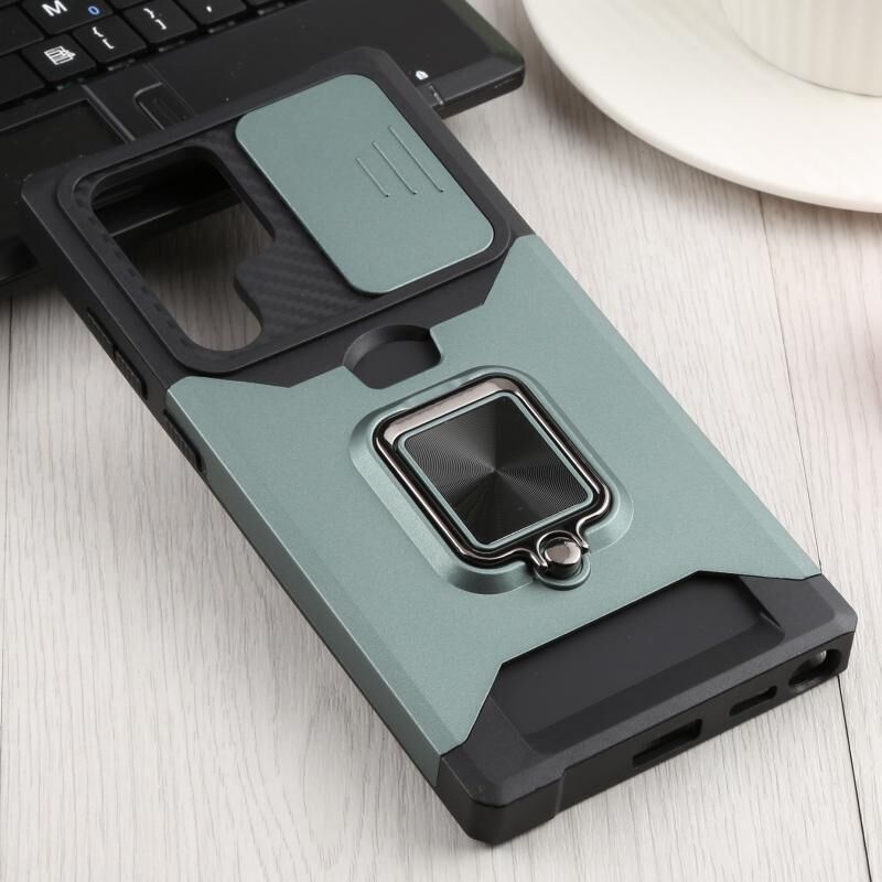 Για Samsung Galaxy S22 Ultra 5G συρόμενη κάμερα Cover Design PC + TPU Shockproof υπόθεση τηλεφώνου με θήκη δαχτυλίδι & υποδοχή κάρτας (σκούρο πράσινο)