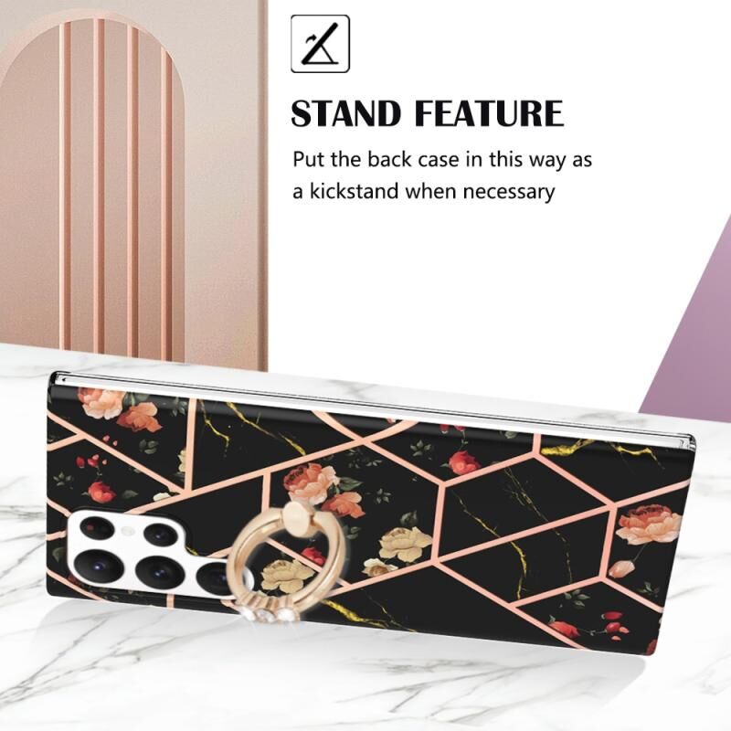 Θήκη για Samsung Galaxy S22 Ultra 5G, με σχέδιο μαρμάρου και λουλουδιών σε στυλ patchwork, από TPU με δακτύλιο στήριξης (Ροζ Λουλούδι)