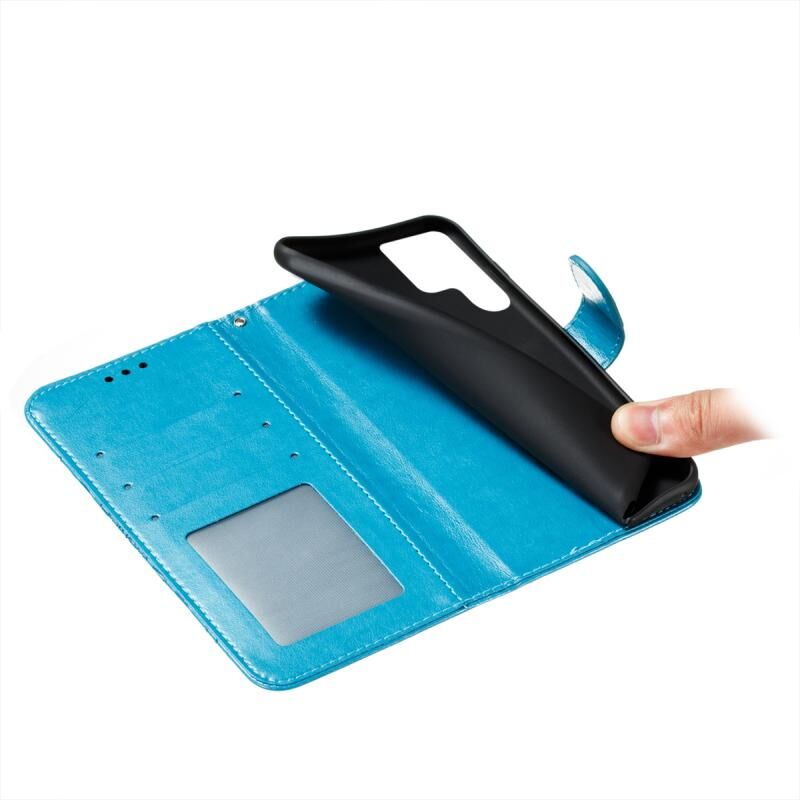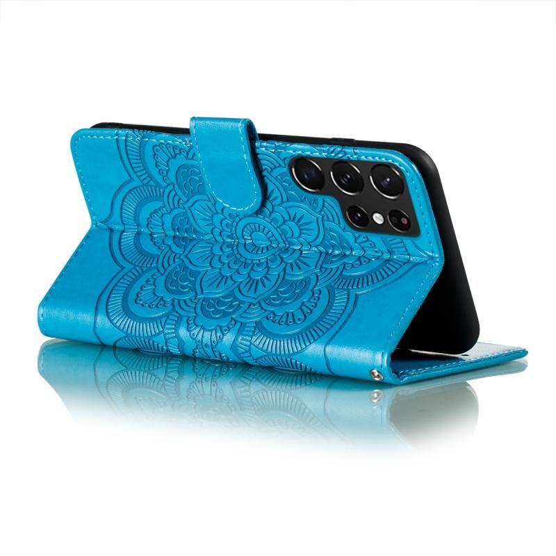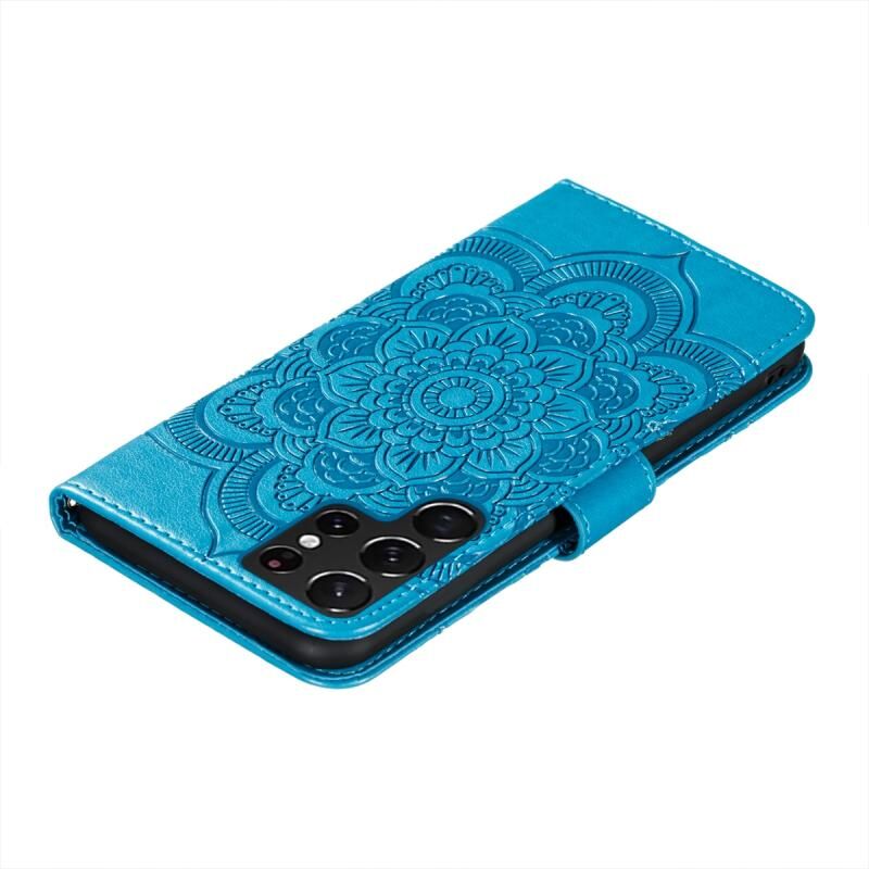 Για Samsung Galaxy S22 Ultra 5G Sun Mandala ανάγλυφο μοτίβο τηλέφωνο δερμάτινη θήκη με θήκη & υποδοχές για κάρτες & πορτοφόλι & κορδόνι (μπλε)