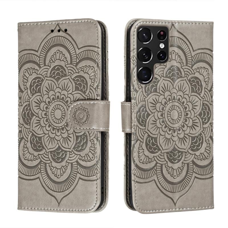 Για Samsung Galaxy S22 Ultra 5G Sun Mandala ανάγλυφο μοτίβο τηλέφωνο δερμάτινη θήκη με κάτοχο & υποδοχές για κάρτες & πορτοφόλι & κορδόνι (γκρι)
