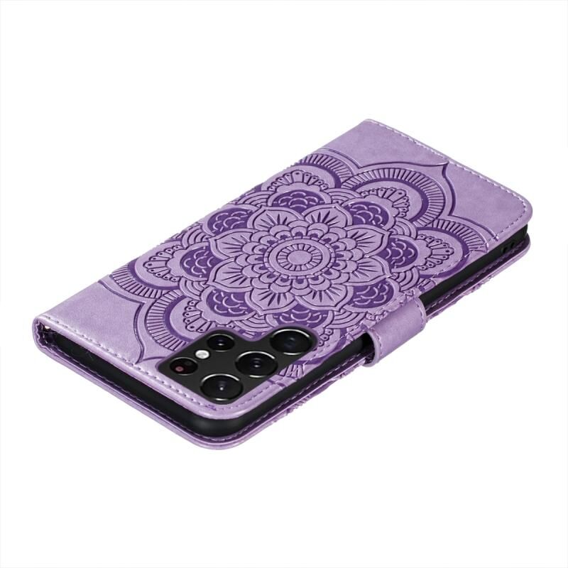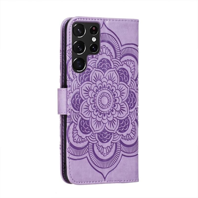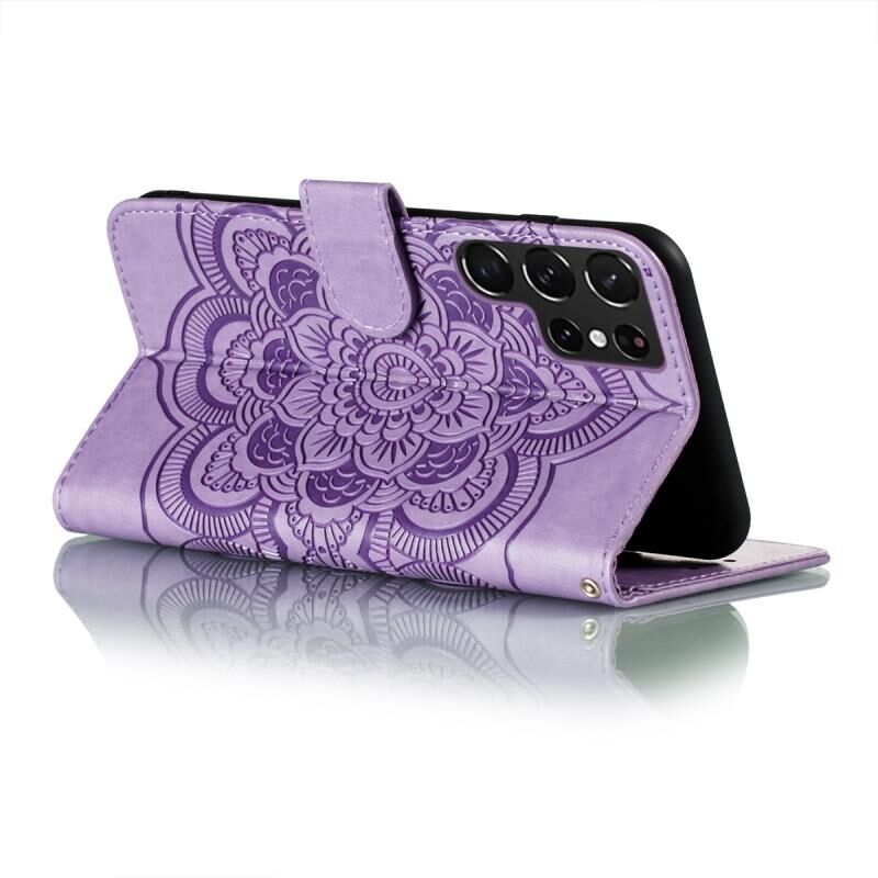Για Samsung Galaxy S22 Ultra 5G Sun Mandala ανάγλυφο μοτίβο τηλέφωνο δερμάτινη θήκη με κάτοχο & υποδοχές για κάρτες & πορτοφόλι & κορδόνι (μωβ)