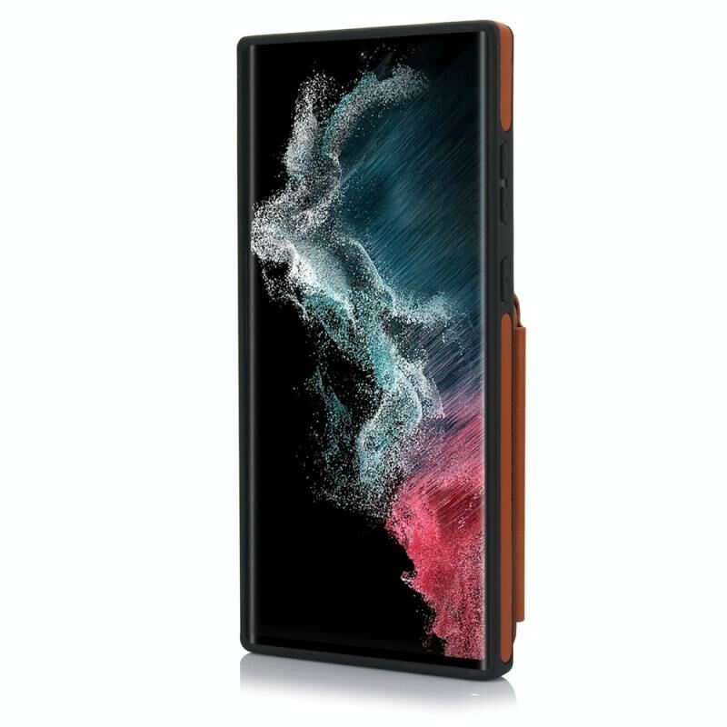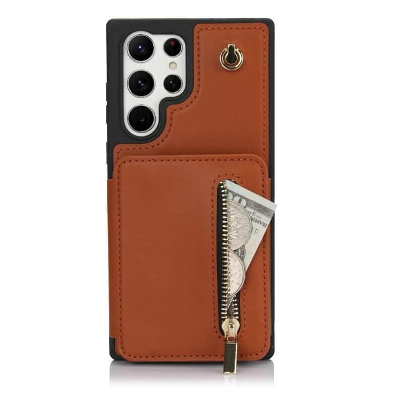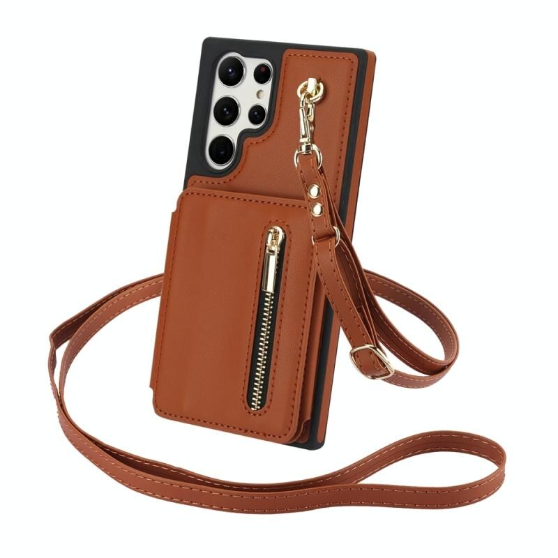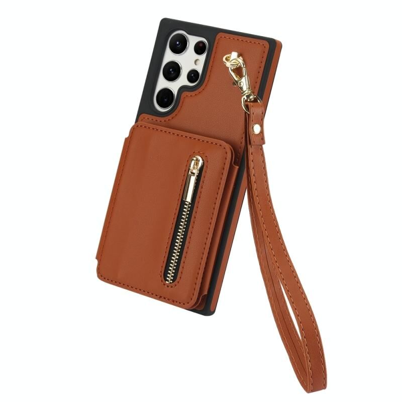 Για Samsung Galaxy S22 Ultra 5G YM006 δέρμα αίσθηση φερμουάρ κάρτα τσάντα υπόθεση τηλεφώνου με διπλή κορδόνι (καφέ)