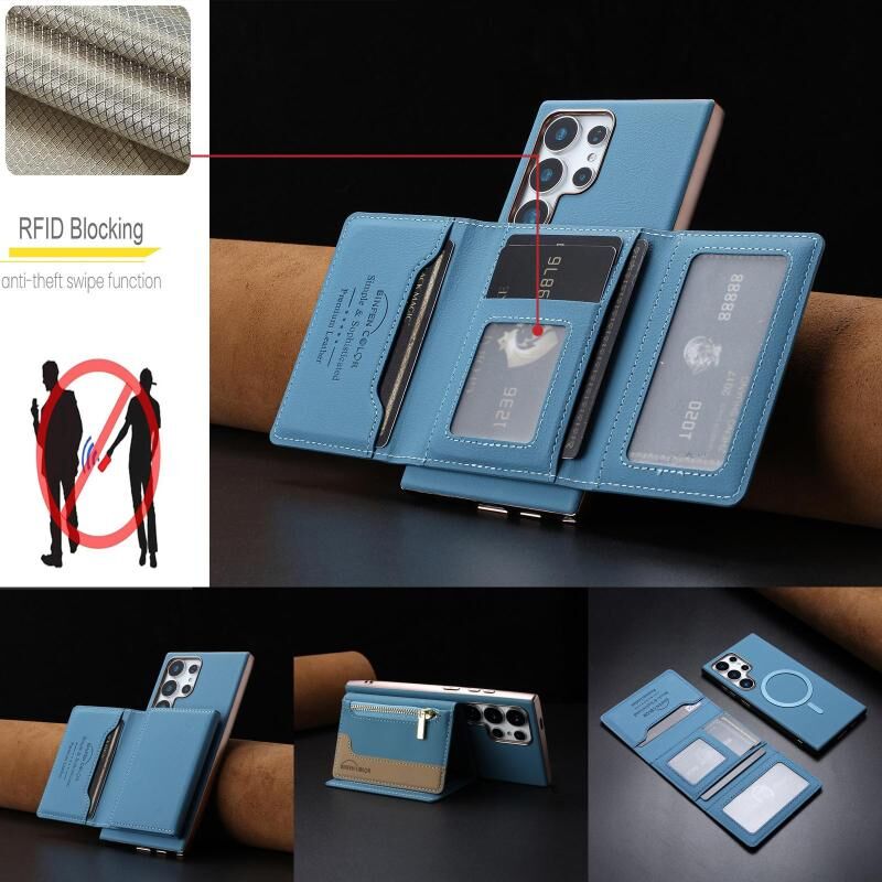 2. Magnetic Tri-Fold Wallet Design: Features a horizontal fold with a strong magnetic closure for easy access and secure storage.