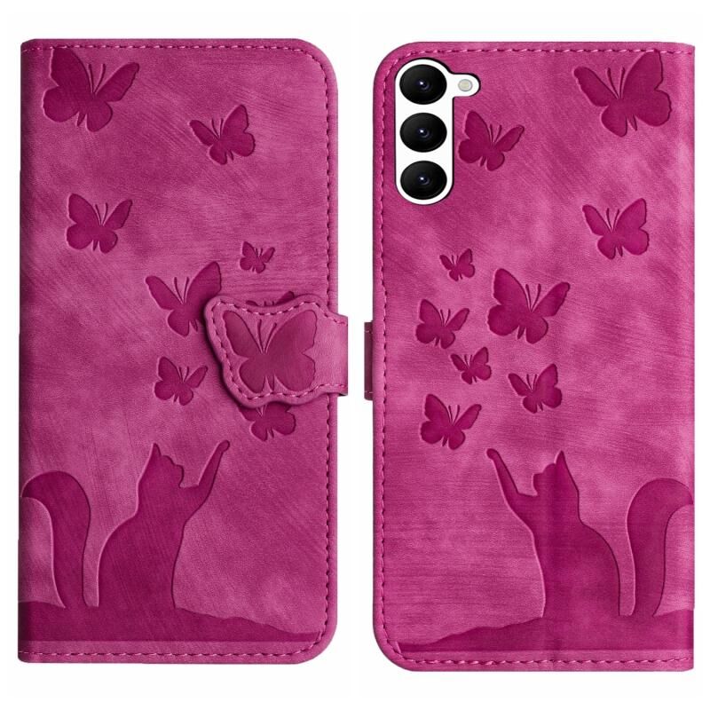 Θήκη τηλεφώνου Samsung Galaxy S23+ 5G, δερμάτινη, τύπου flip, με ανάγλυφο σχέδιο πεταλούδας και γάτας (Μωβ)