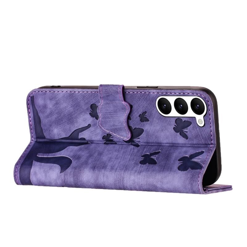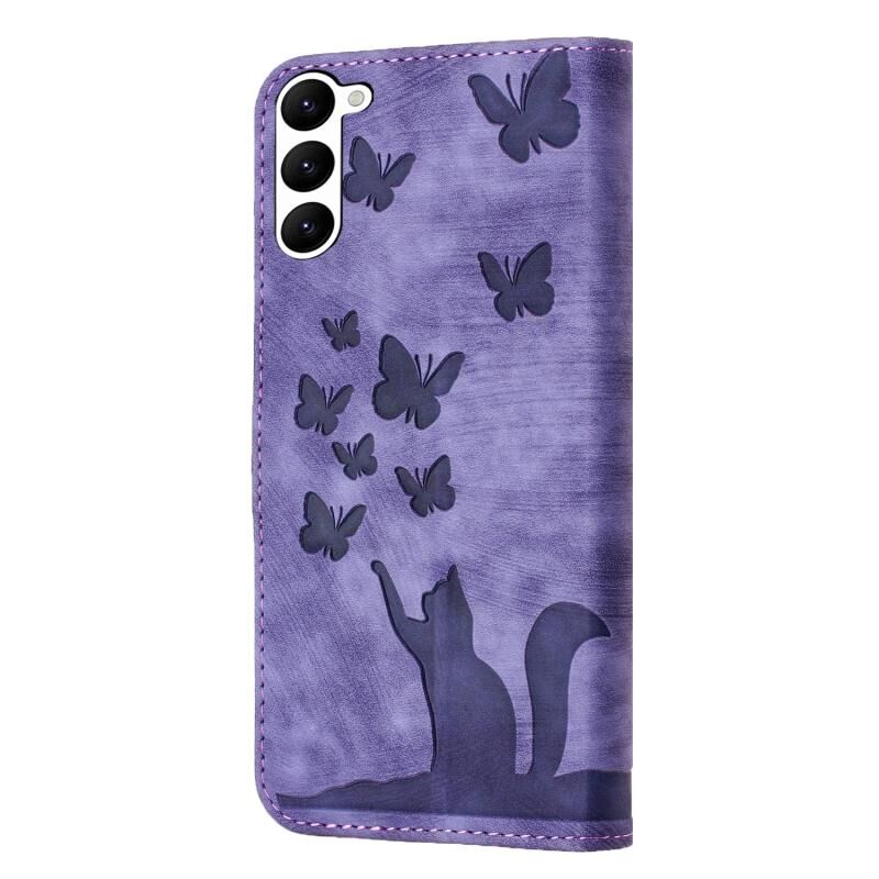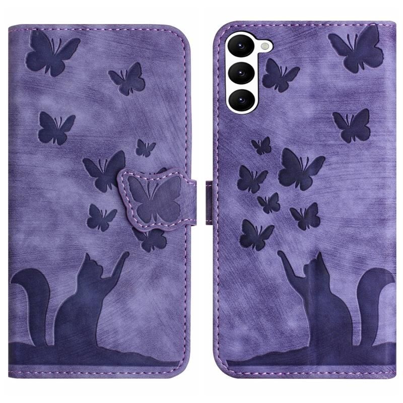 Θήκη τηλεφώνου Samsung Galaxy S23+ 5G, δερμάτινη, τύπου flip, με ανάγλυφο σχέδιο πεταλούδας και γάτας (Μωβ)