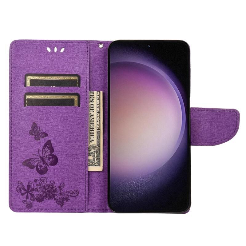 Θήκη τηλεφώνου Samsung Galaxy S23 5G, δερμάτινη οριζόντια με ανάγλυφο σχέδιο πεταλούδας (Καφέ)