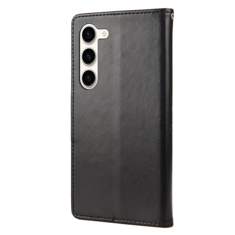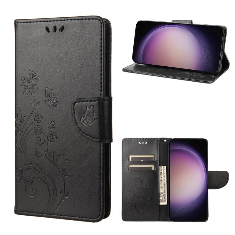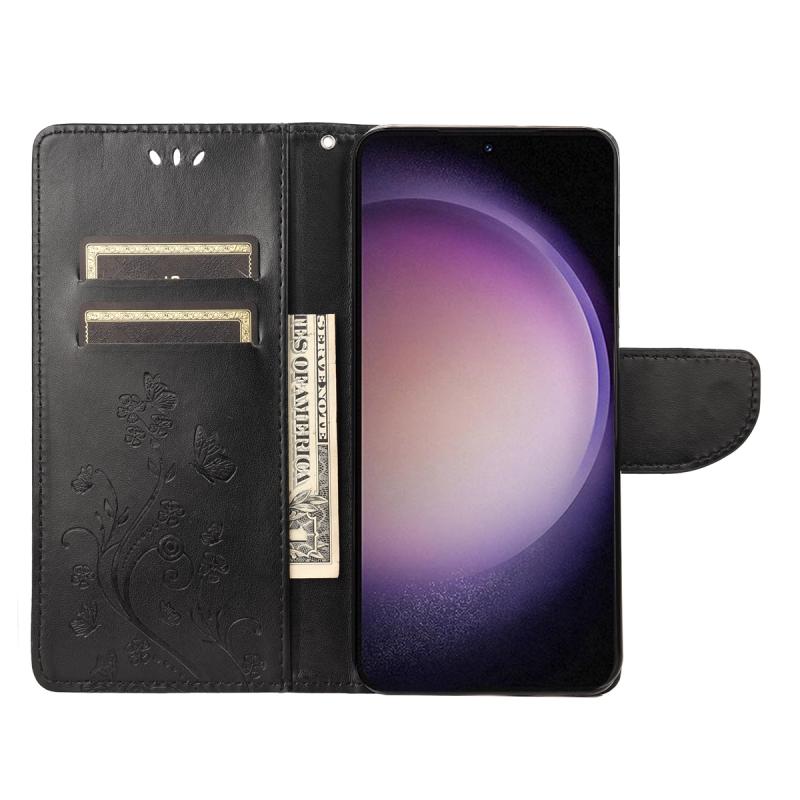 Θήκη τηλεφώνου Samsung Galaxy S23+ 5G, δερμάτινη, με σχέδιο πεταλούδας και λουλουδιών (Μαύρο)