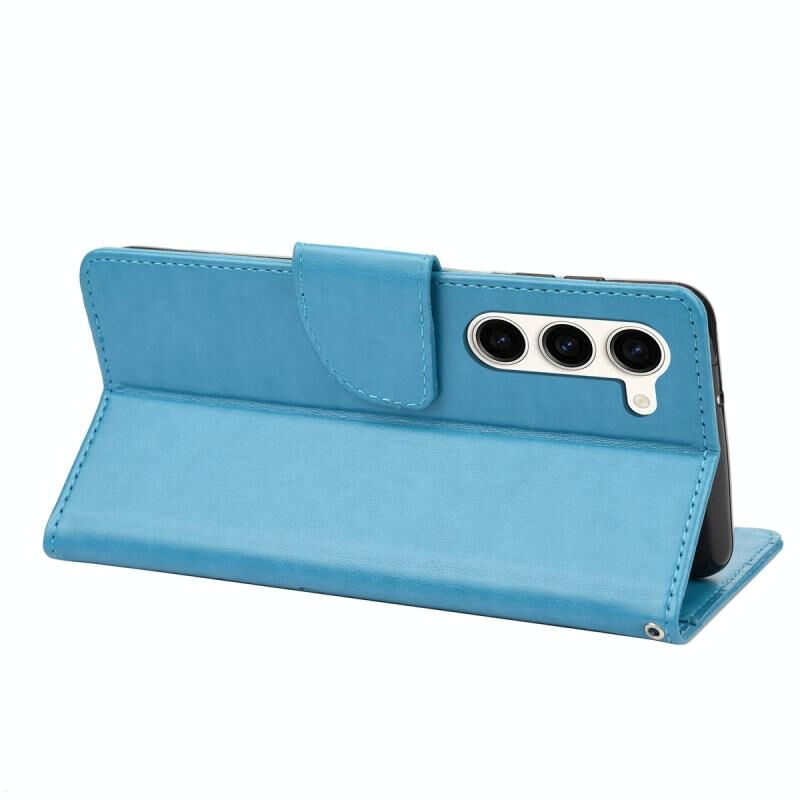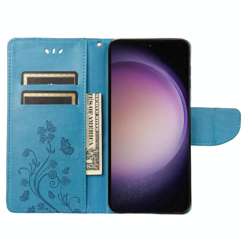 Θήκη τηλεφώνου Samsung Galaxy S23+ 5G, δερμάτινη, με σχέδιο πεταλούδας και λουλουδιών (Μπλε)