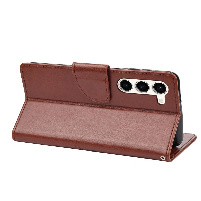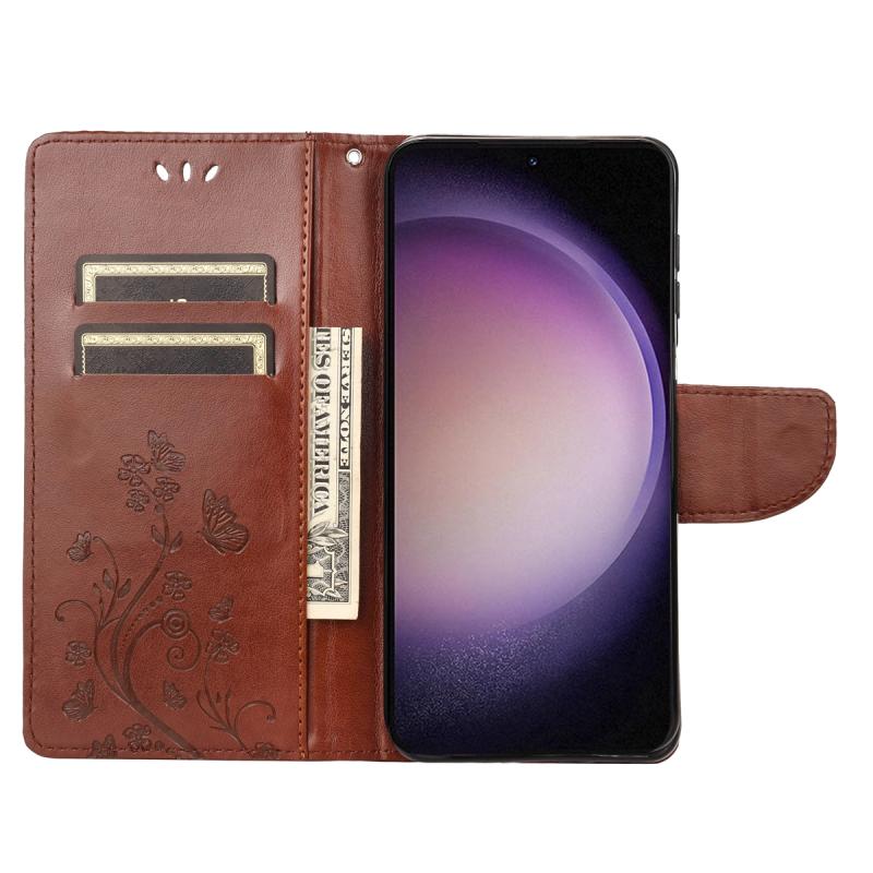 Θήκη τηλεφώνου Samsung Galaxy S23+ 5G, δερμάτινη, με σχέδιο πεταλούδας και λουλουδιών (Καφέ)