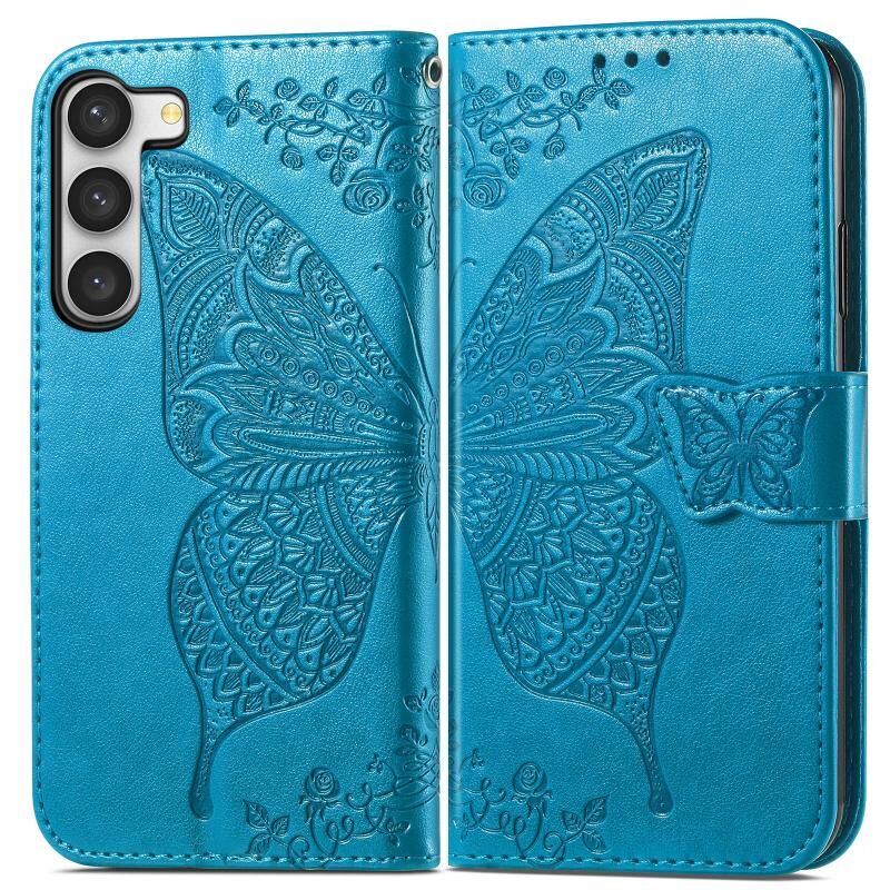 Θήκη τηλεφώνου Samsung Galaxy S23+ 5G από δέρμα με ανάγλυφο σχέδιο πεταλούδας και λουλουδιών (Μπλε)
