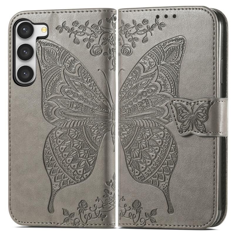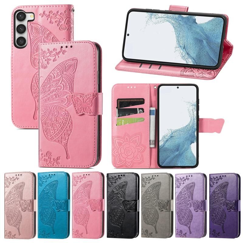 Θήκη τηλεφώνου Samsung Galaxy S23 5G από δέρμα με ανάγλυφο σχέδιο πεταλούδας και λουλουδιών (Χρυσό ροζ)