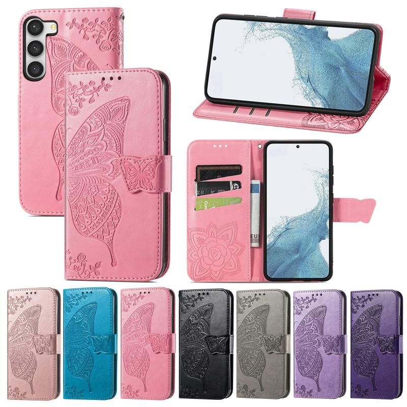 Θήκη τηλεφώνου Samsung Galaxy S23 5G από δέρμα με ανάγλυφο σχέδιο πεταλούδας και λουλουδιών (Χρυσό ροζ)