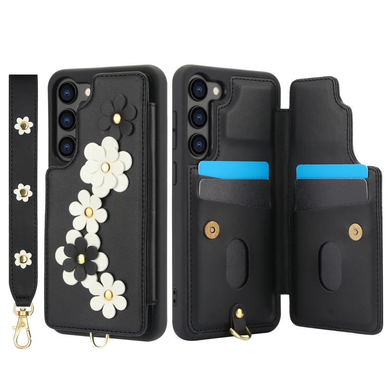 For Samsung Galaxy S23+ 5G Crossbody Flower Pattern Leather Phone Case(Black)
