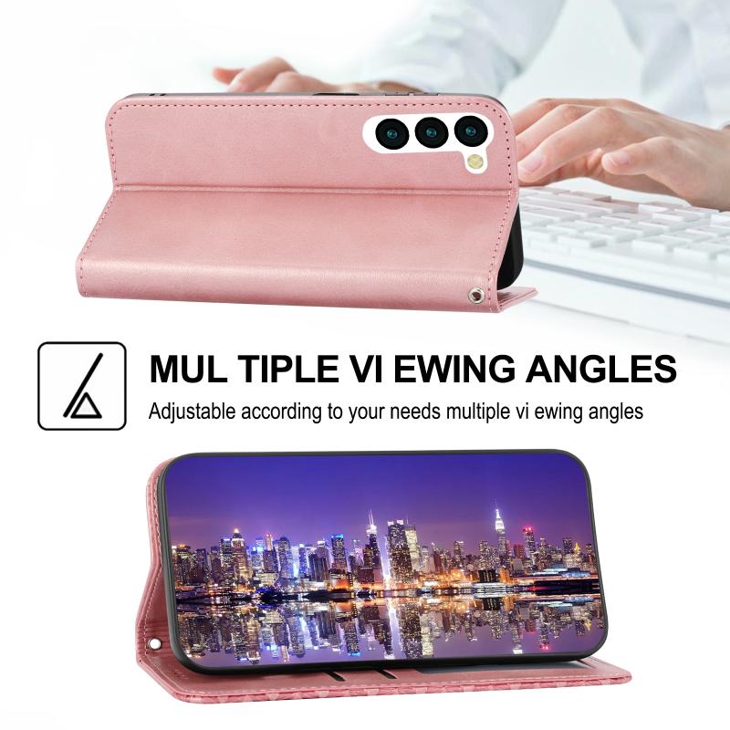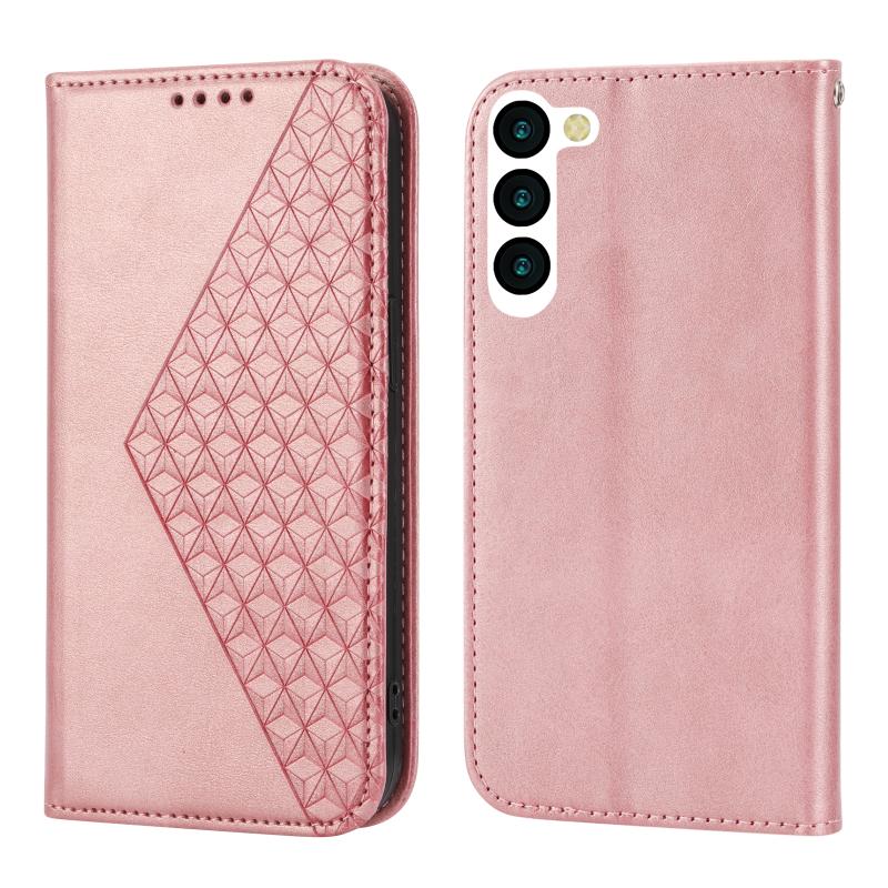 Θήκη κινητού Samsung Galaxy S23 5G από δέρμα με μαγνητική απορρόφηση, με υφή μοσχαρίσιου δέρματος και κυβικό σχέδιο (Ροζ χρυσός)