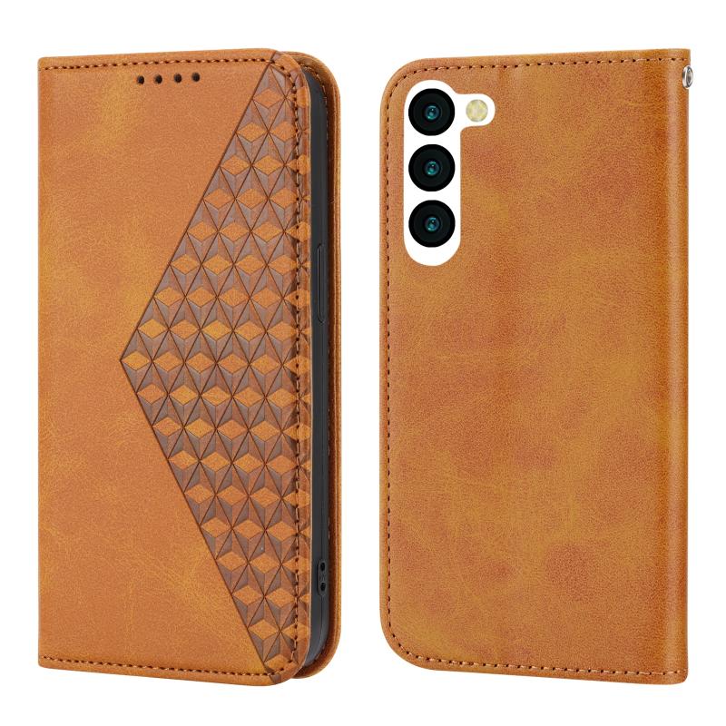 Θήκη κινητού Samsung Galaxy S23+ 5G από δέρμα με μαγνητική απορρόφηση, με υφή μοσχαρίσιου δέρματος σε κυβικό πλέγμα (Κίτρινο)