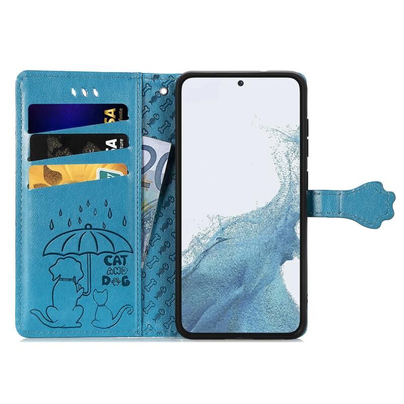 Θήκη τηλεφώνου από δέρμα με ανάγλυφα σχέδια χαριτωμένων γάτας και σκύλου για Samsung Galaxy S23+ 5G (Μωβ)