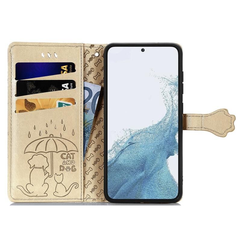 Θήκη τηλεφώνου από δέρμα με ανάγλυφα σχέδια χαριτωμένων γάτας και σκύλου για Samsung Galaxy S23+ 5G (Μωβ)