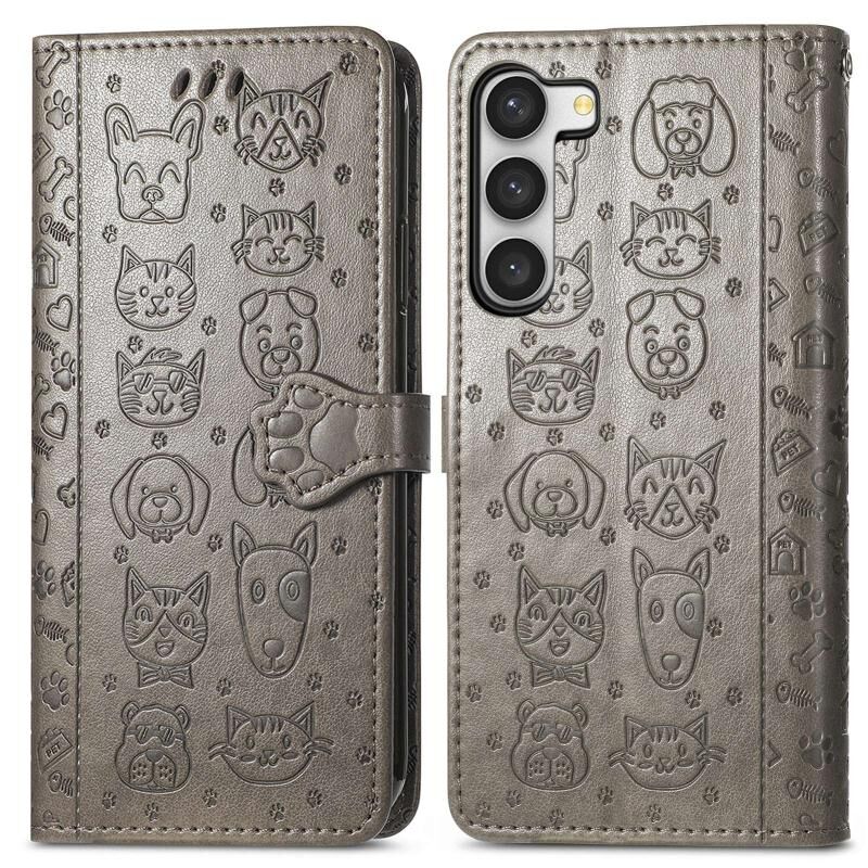 Θήκη τηλεφώνου από δέρμα με ανάγλυφα σχέδια χαριτωμένων γάτας και σκύλου για Samsung Galaxy S23 5G (Μωβ)