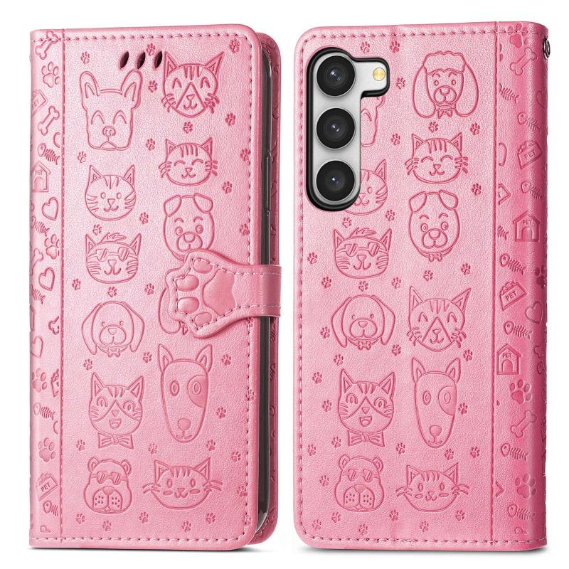 For Samsung Galaxy S23 5G Cute Cat and Dog Embossed Leather Phone Case(Pink)