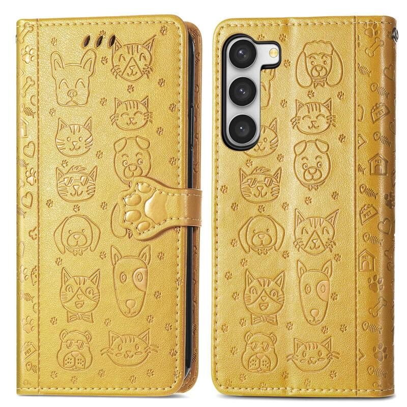 Θήκη τηλεφώνου από δέρμα με ανάγλυφα σχέδια χαριτωμένων γάτας και σκύλου για Samsung Galaxy S23 5G (Μωβ)