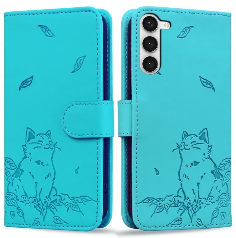 Θήκη τηλεφώνου από δέρμα με ανάγλυφο χαριτωμένο γατάκι για Samsung Galaxy S23 5G (Γαλάζια Λίμνη)