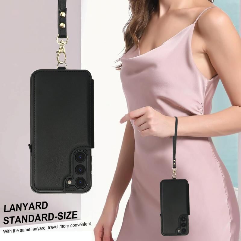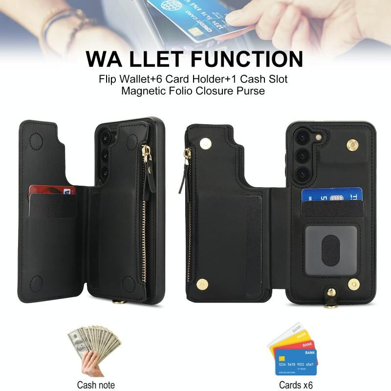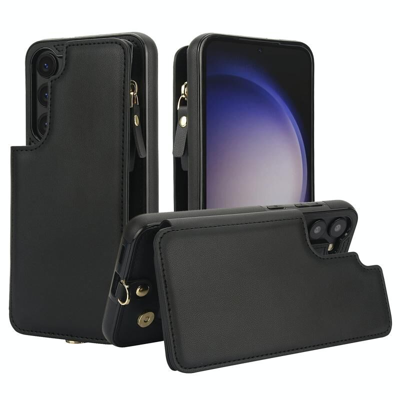 Θήκη τηλεφώνου Samsung Galaxy S23+ 5G από δέρμα με διπλό φερμουάρ και RFID, με κοντό κορδόνι (Μαύρο)