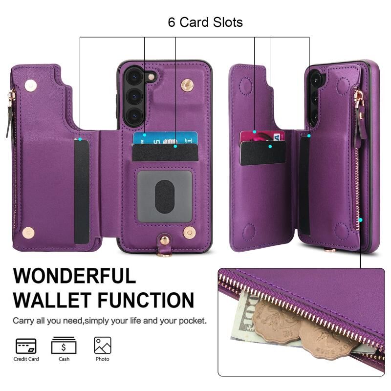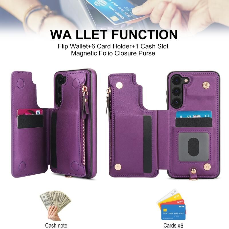 Θήκη τηλεφώνου Samsung Galaxy S23+ 5G από δέρμα με διπλό φερμουάρ και RFID, με κοντό κορδόνι (Σκούρο μωβ)