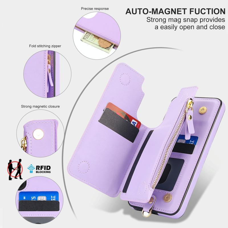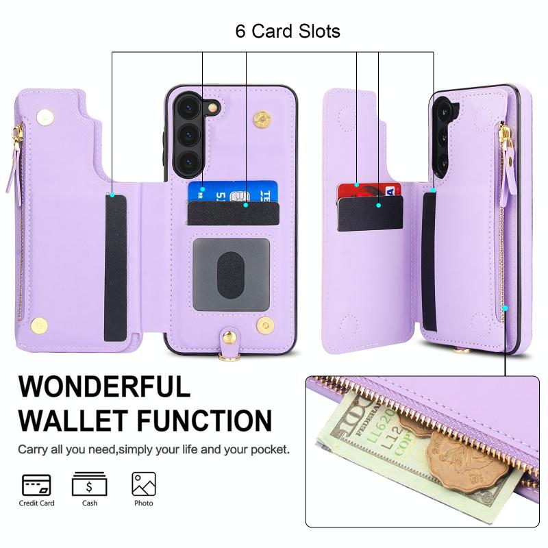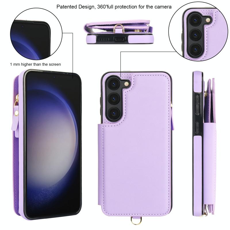 For Samsung Galaxy S23 5G Double Flap Zipper RFID Leather Phone Case with Short Lanyard(Light Purple)